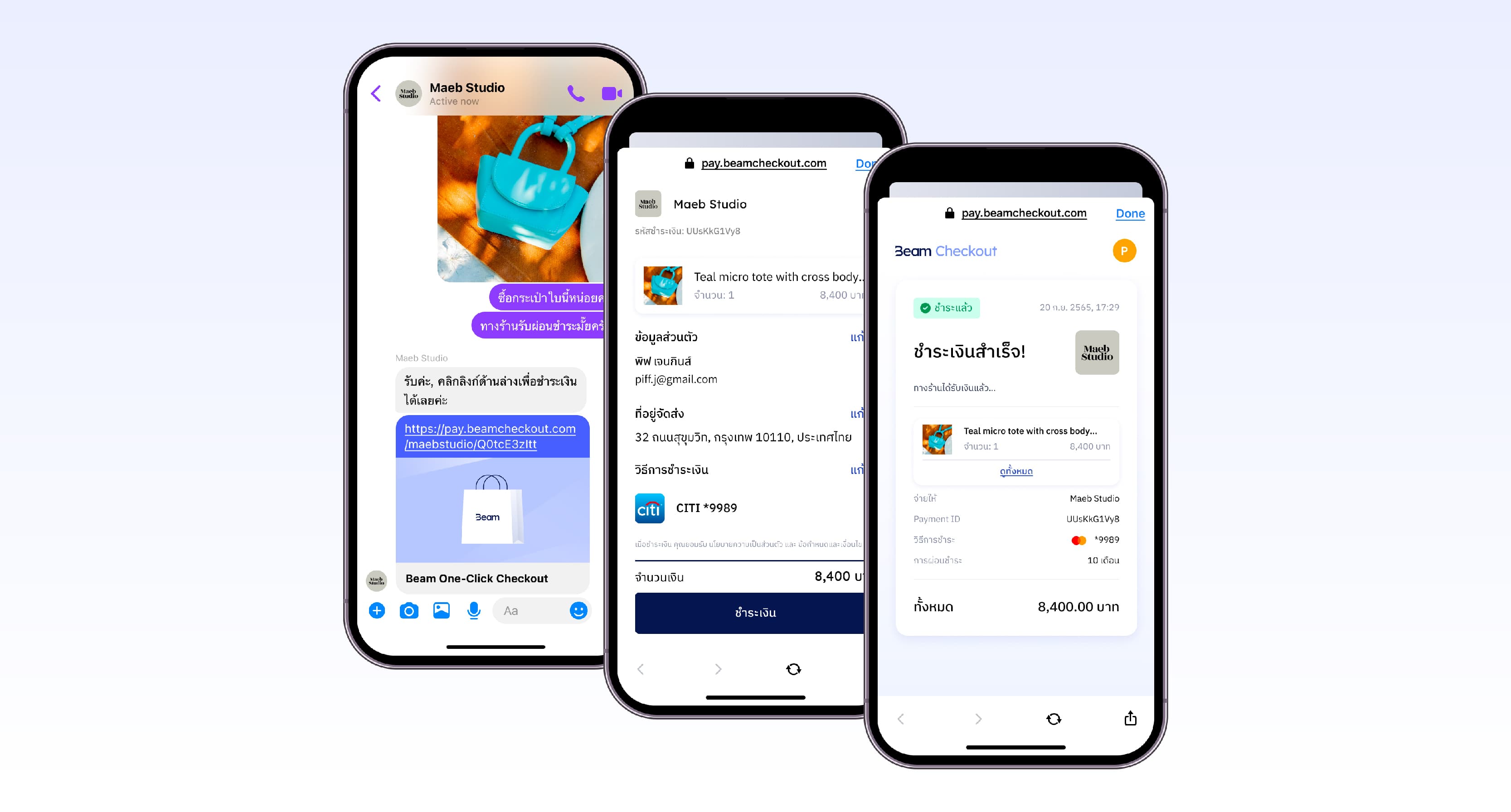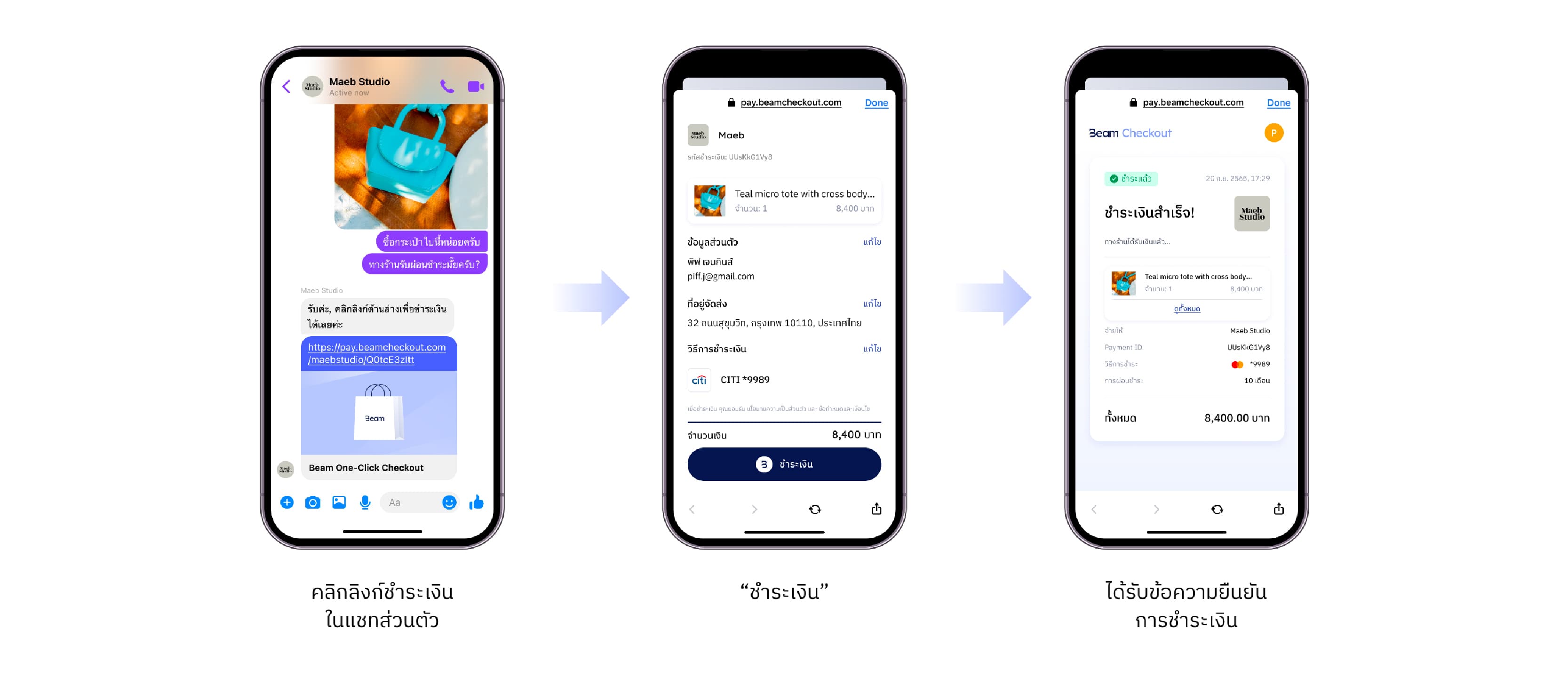 ลูกค้าชอบสินค้า ทักแชทมาถามและตัดสินใจซื้อ → คลิกลิงก์ชำระเงิน → ใส่ข้อมูลจัดส่งและชำระเงิน