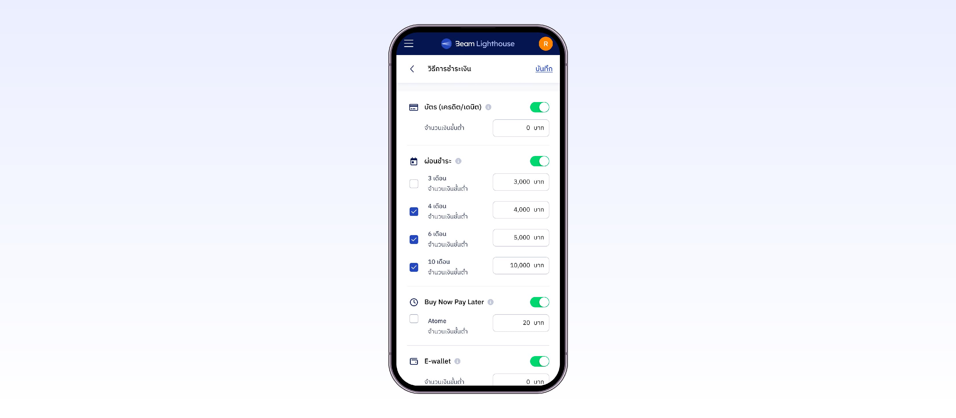 เลือกเปิด/ปิดวิธีชำระเงินได้ตามต้องการ: Beam มีฟีเจอร์ที่ช่วยให้ร้านค้าเปิดหรือปิดช่องทางการชำระเงินเองได้ รวมถึงสามารถตั้งจำนวนเงินขั้นต่ำสำหรับแต่ละวิธีชำระเงินเองได้ด้วย เช่น หากร้านค้าเปิดใช้บัตร แต่ปิดผ่อนชำระ ลูกค้าก็จะไม่สามารถผ่อนได้ ร้านค้าสามารถใช้ฟีเจอร์นี้ปรับแต่งช่องทางการชำระเงินตามกลยุทธ์การขายของตัวเองได้เลย
